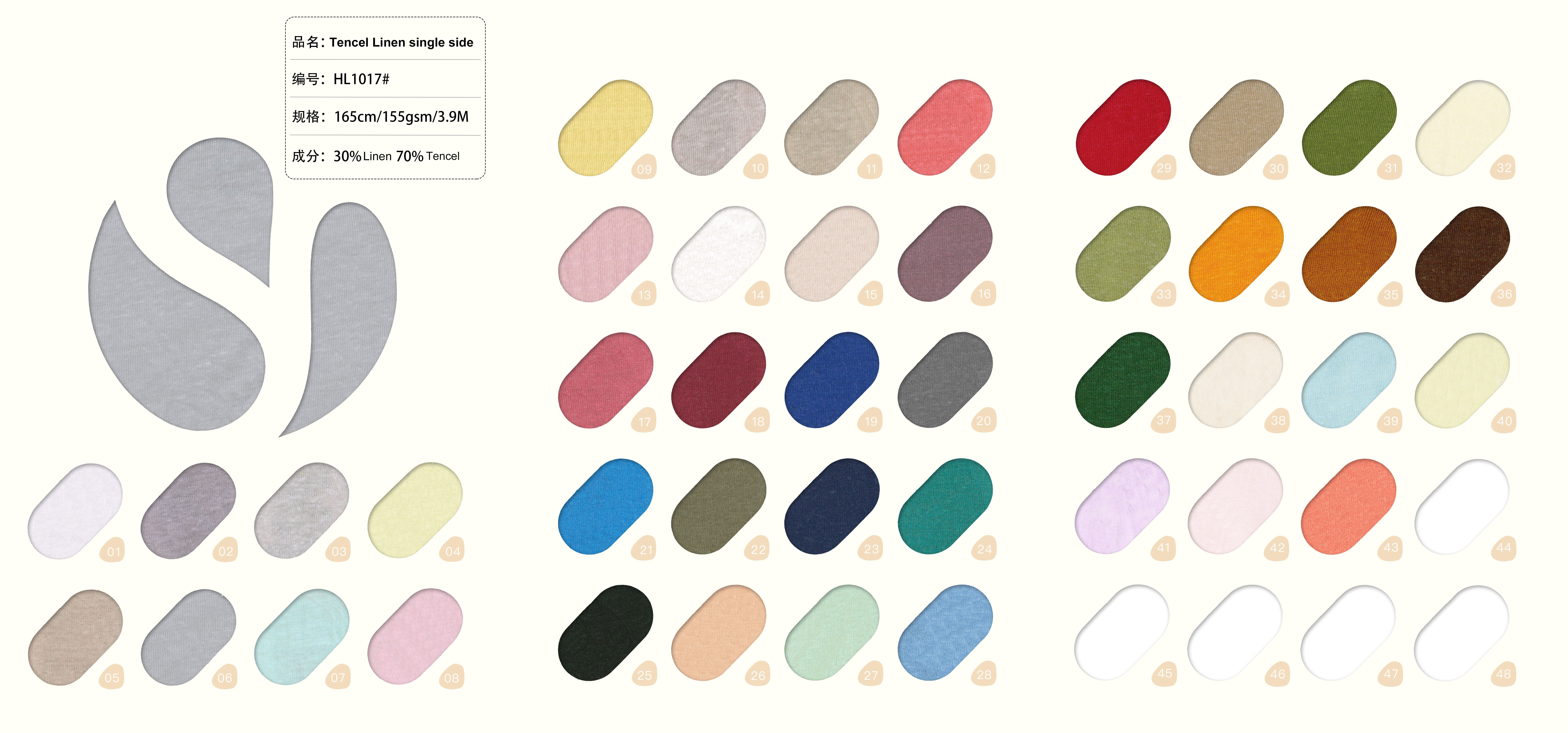 | Tencel linen jersey (T-shirt) | HL1017 | 70% Lenzing Tencel, 30% Linen | 155g/m2 | 165cm | https://pigeonwishes.com/wp-content/uploads/2024/05/HL1017-Tencel-linen-single-side-1.jpg | |